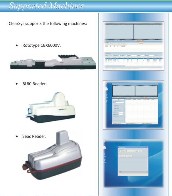 BENEFITS • Low capital investment and ongoing costs. • Capability of scanning front and back of checks, during the clearing process. • Easy to archive and retrieve check images. • Check sorting based on configurable criteria. • Reduce check processing time. • Reduce check rejection rates. • Faster and easier check verification. • Detailed electronic check reporting. • Support regionalized and centralized check processing system. • Increase in customer satisfaction. Centralized reporting system. This is the centralized reporting system via which all reports could be generated.